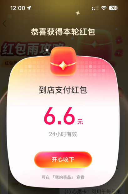 支付有礼页面,每个整点可以抢红包雨,6.6元