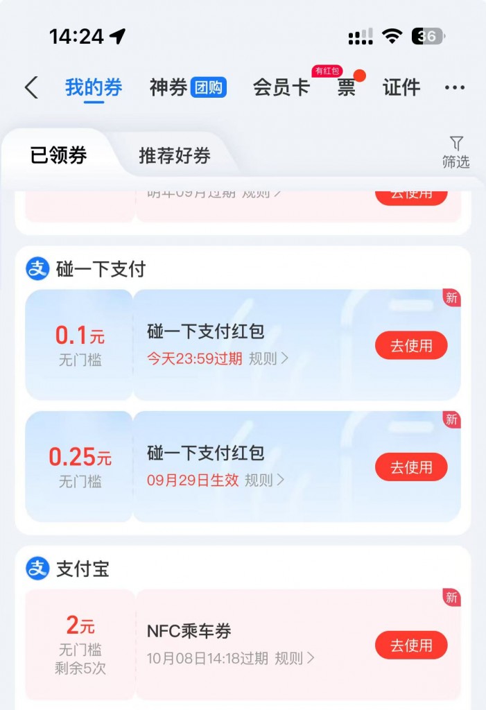 支付宝 公交地铁 5笔2元 碰一下乘车立减券