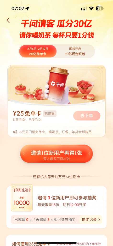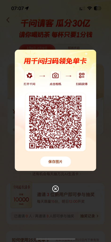 千问 喝奶茶只要1分钱,直接用淘宝或者支付宝登陆千问即可 【千问】复制口令,打开千问App,千问请客,瓜分30亿!#54e03AOtzW# 免单链接(点我) 或者扫描下方二维码